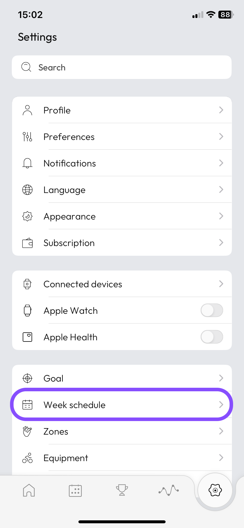 En la aplicación ( iOS / Android ), haz clic en el icono de engranaje en la parte inferior derecha para abrir la página de configuración y luego en «Horario semanal». La página desplegada muestra todos los momentos en los que 2PEAK puede programar una sesión de entrenamiento para ti.