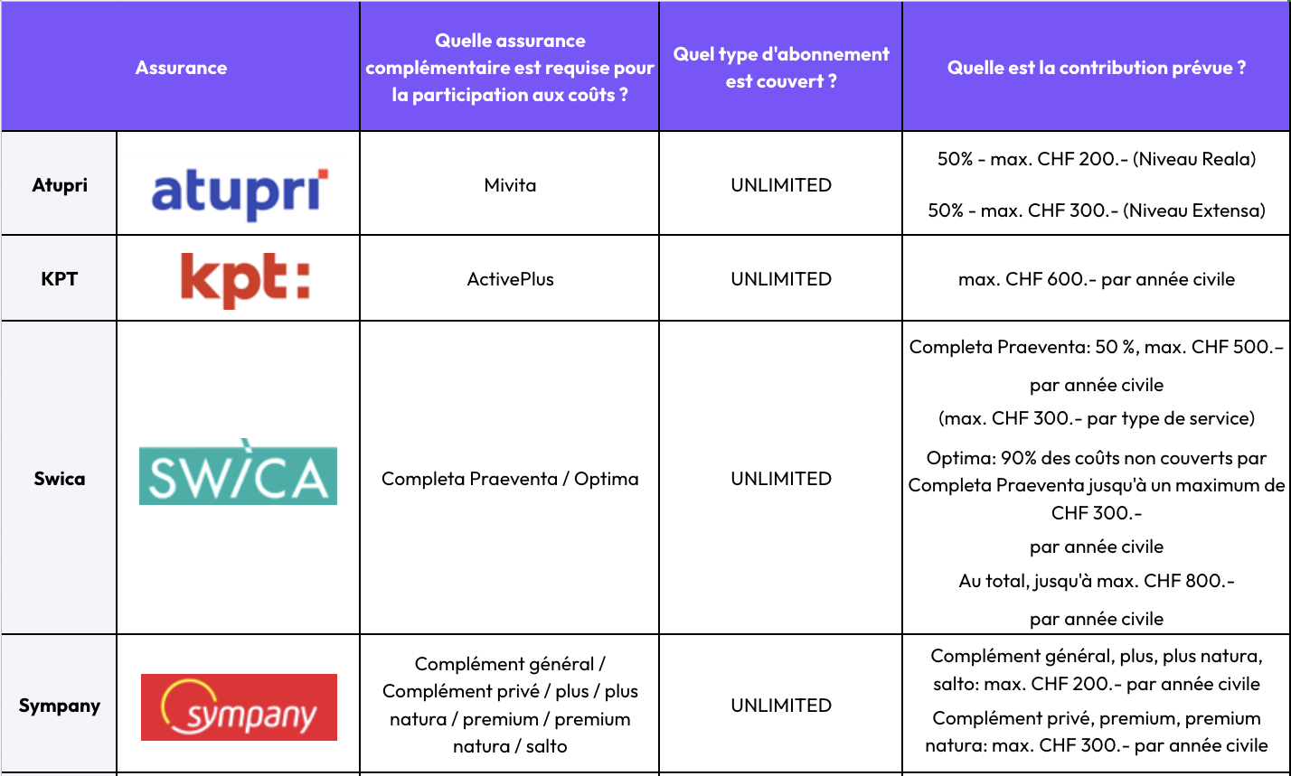 Découvre dans le tableau suivant dans quelle mesure ton assurance couvre les coûts de ton abonnement :