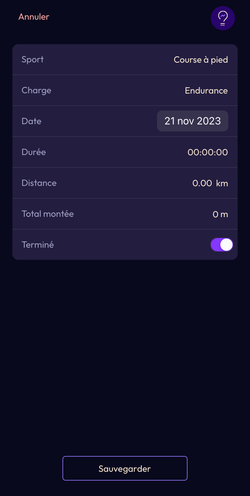 Une page apparaît, sur laquelle tu peux saisir la forme, la durée et l’intensité de l’entraînement prévu.