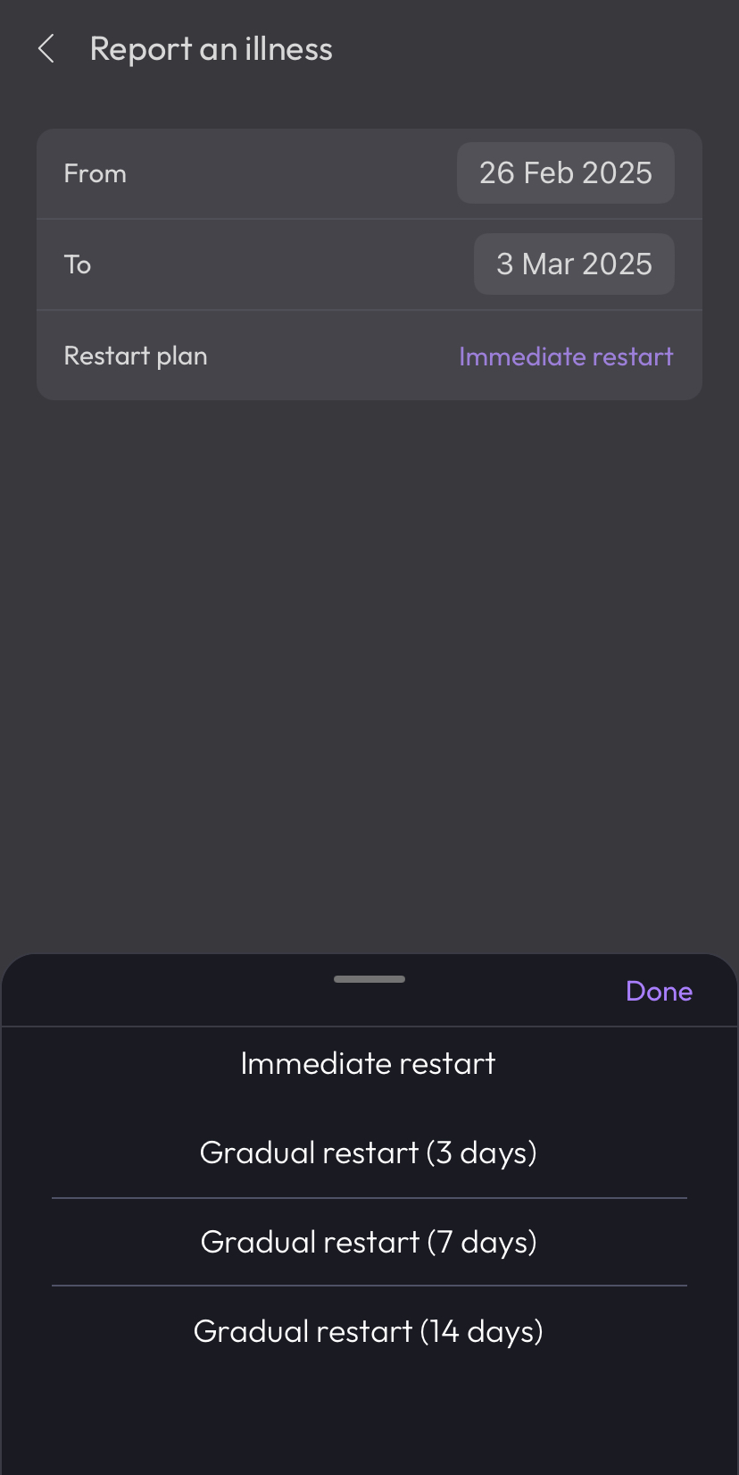 Saisis la date de début de ta pause et ton estimation de la date de fin. Cette dernière pourra toujours être modifiée ultérieurement.